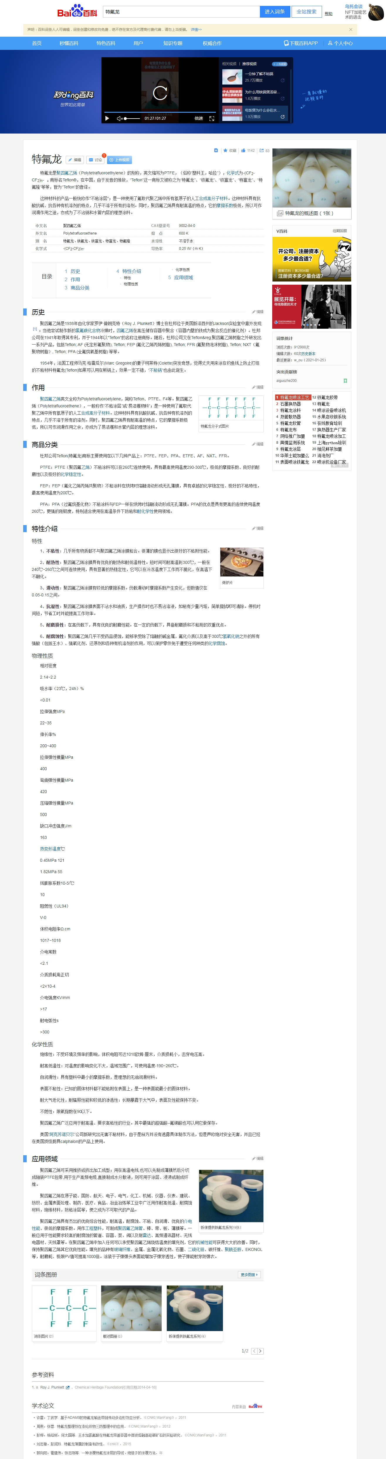 特氟龙是聚四氟乙烯(Polytetrafluoroethylene)的别称,英文缩写为PTFE,(俗称“塑料王,哈拉”),化学式为-(CF2-CF2)n- 。商标名Teflon®,在中国,由于发音的缘故,“Teflon”这一商标又被称之为“特氟龙”、“铁氟龙”、“铁富龙”、“特富龙”、“特氟隆”等等,皆为“Teflon”的音译。